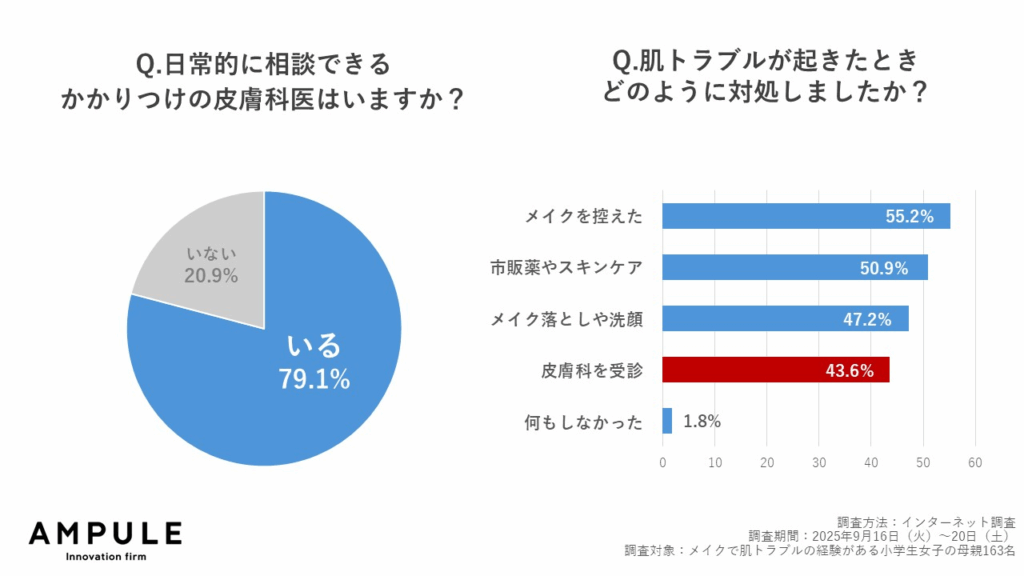一方で、肌トラブルが起きた際に実際にとった対応を聞くと、「メイクを控えた」(55.2%)「市販の薬やスキンケア」(50.9%)、「メイク落としや洗顔」(47.2%)、「皮膚科を受診」(43.6%)、「特に何もしなかった」(1.8%) という結果になりました。かかりつけ医が「いる」家庭が多いにもかかわらず、実際に皮膚科を受診したのは約4割(43.6%)に留まっており、多くの家庭が自己流のケアに頼っていることが明らかになりました。