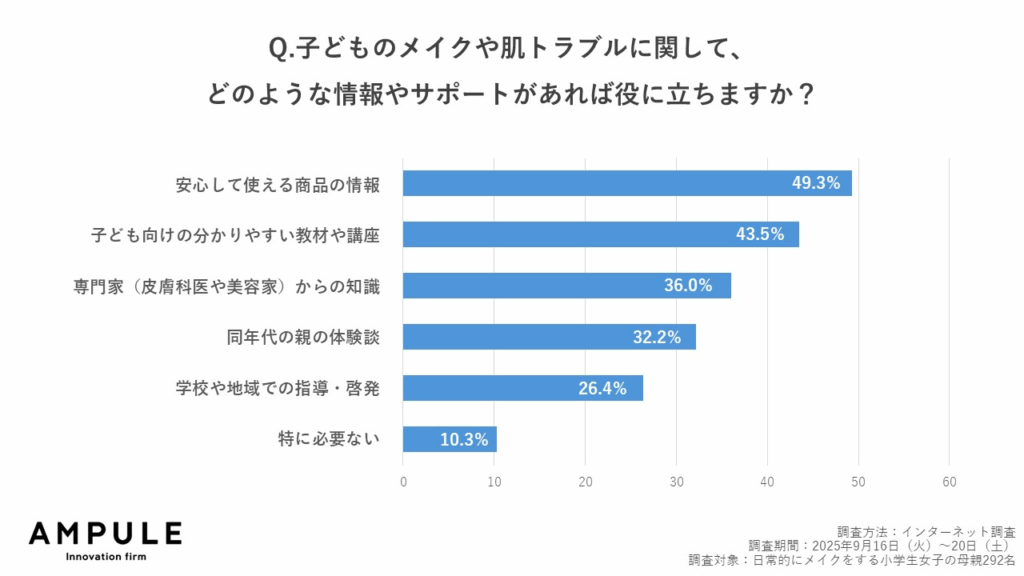 最後に「子どものメイクや肌トラブルに関して、どのような情報やサポートがあれば役立つか」を聞いたところ、「安心して使える商品の情報」(49.3%)が最も多く、次いで「子ども向けの分かりやすい教材や講座」(43.5%)、「専門家(皮膚科医や美容家)からの知識」(36.0%)が挙がりました。「特に必要ない」(10.3%)を除いた約9割の母親が、安全にメイクを楽しむための正しい知識や学びの場を必要としていることがわかります。