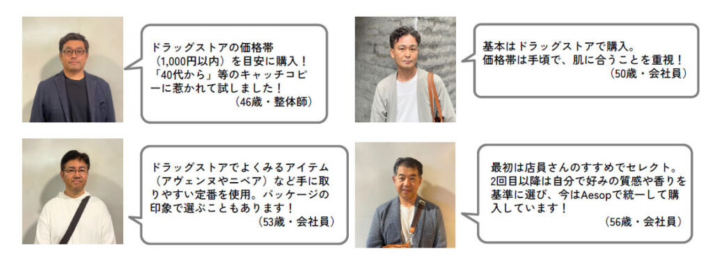 日常的にスキンケアを実践しているという40~50代の男性に聞いてみると、加齢による見た目の変化をきっかけにスキンケアをはじめたという方が多くいらっしゃいました。そして実際にケアをしてみて効果を実感できると、手間をかける理由に納得して継続することができるとのこと。アイテムの購入先はドラッグストアが主流。価格帯は1,000円前後が目安となるようです。