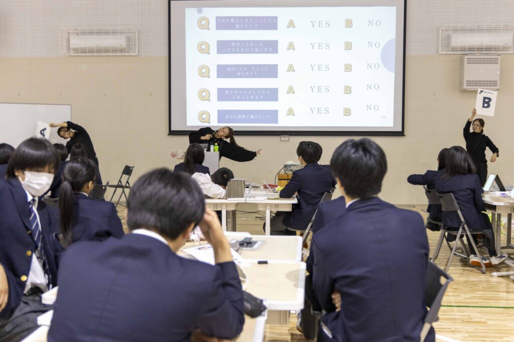 ampuleとイガリシノブさんとの共同プロジェクト「メ育(めいく)プロジェクト」の活動として、渋谷区の広尾中学校と松濤中学校にて「メ育授業」を開催。全区立の小・中学校で実践されている独自の教育プログラム「シブヤ未来科」の一環として開催しました。