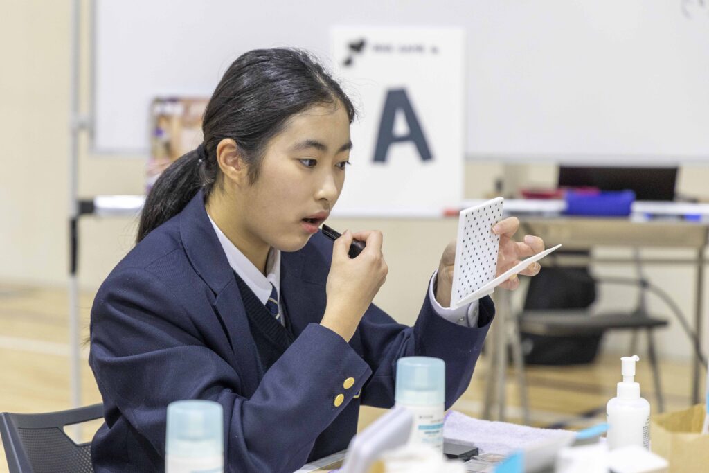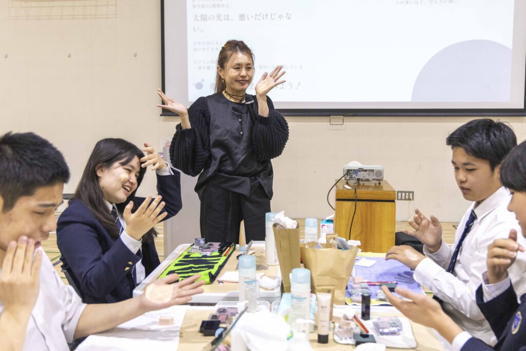「メ育」授業では、メイクをするための方法やコツだけでなく、自分の顔や体を大切にして、楽しくメイクを使って自分らしさを表現することを学びます。